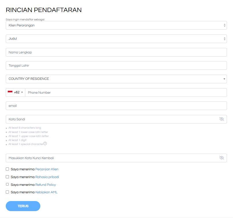 Tips Profesional: Kami merekomendasikan untuk memulai dengan Akun Rookie atau Micro. Keduanya hanya memerlukan deposit kecil, memungkinkan Anda mempelajari dasar-dasar trading tanpa merisikokan banyak uang. Anda juga selalu bisa membuka Akun Demo (uang virtual) terlebih dahulu!
